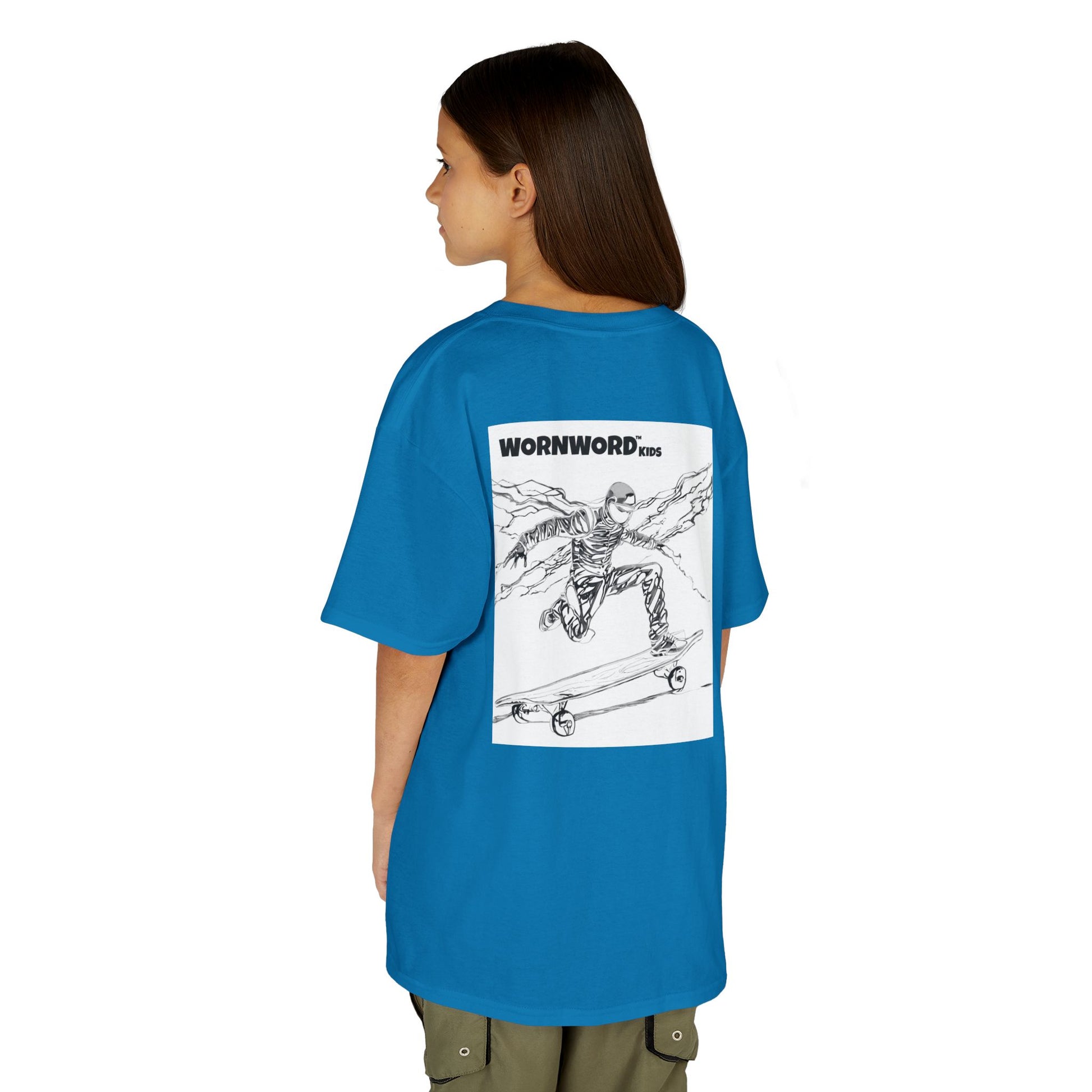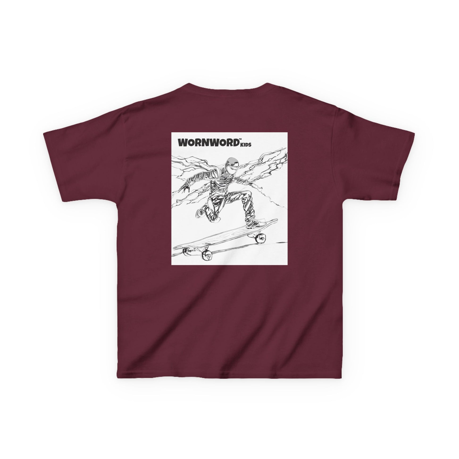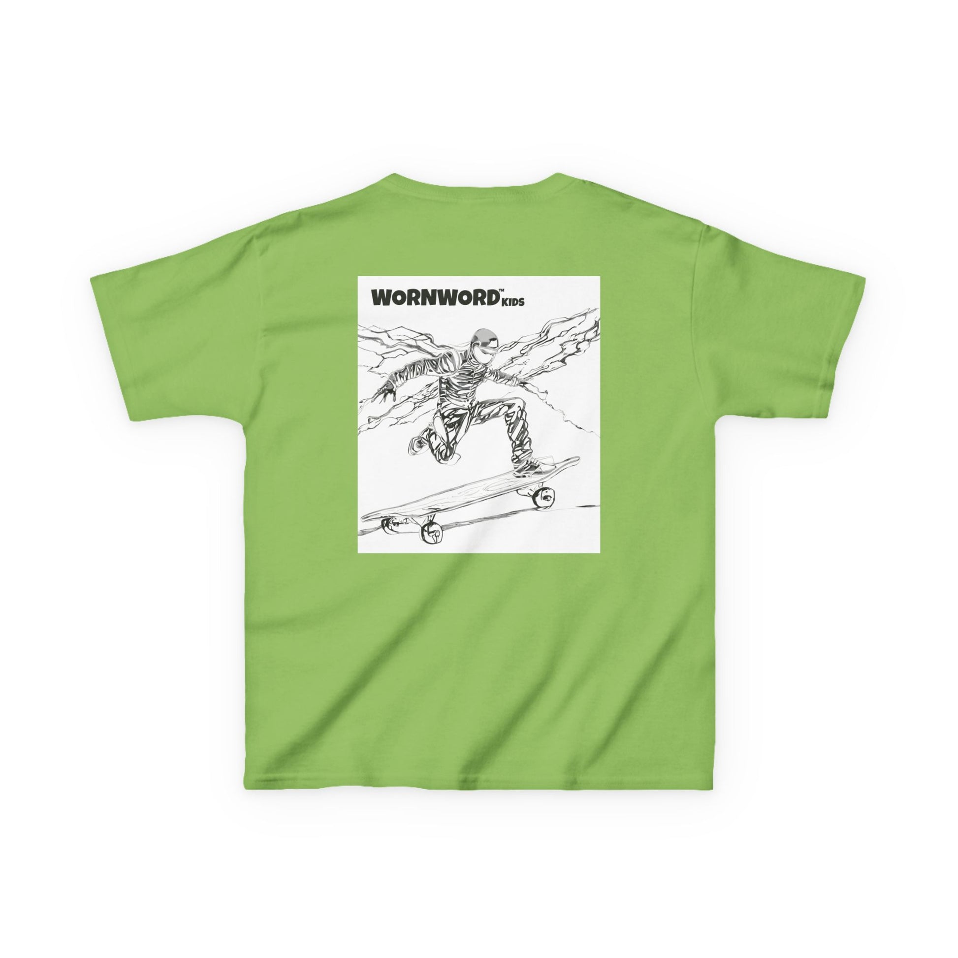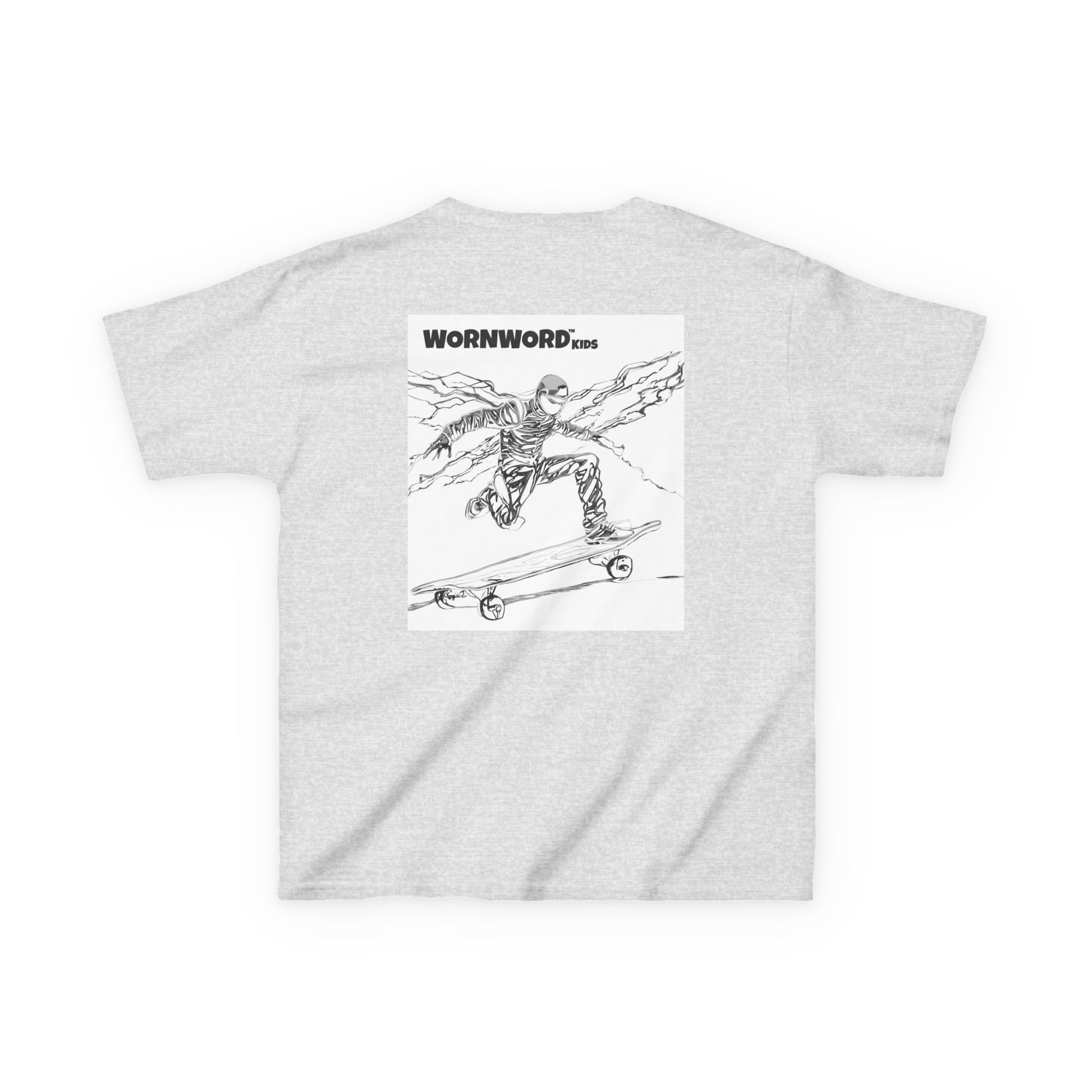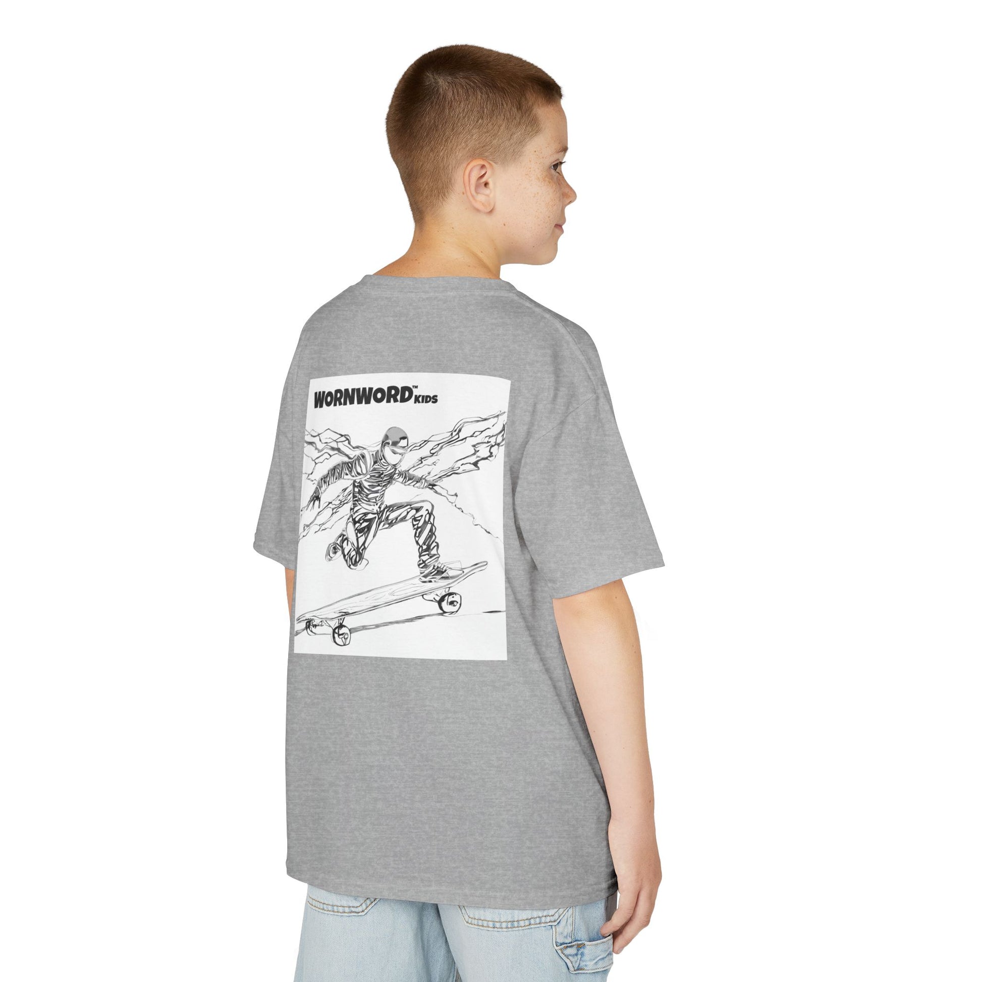 The WORNWORD Kids™ Youth Mid-Weight Tee delivers high-voltage vibes with a bold line-art design of a lightning bolt mid-jump on a skateboard. It's made for the kids who bring energy wherever they go — fearless, fast, and full of spark.